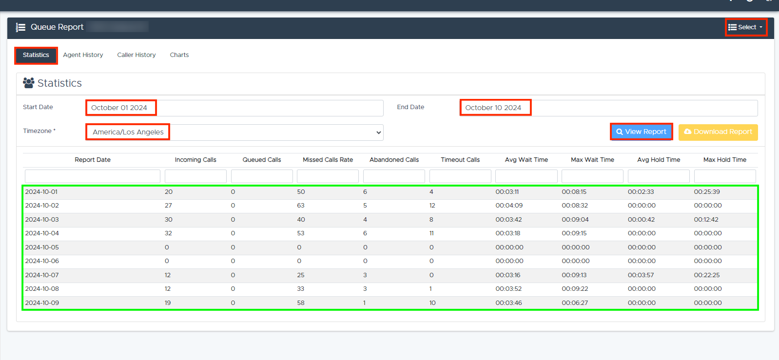 - Haga clic en los encabezados de las columnas (por ejemplo, Fecha del informe, Llamadas entrantes, Llamadas en cola, Tasa de llamadas perdidas, Llamadas abandonadas, Llamadas con tiempo de espera, etc.) para ordenar en orden ascendente o descendente.